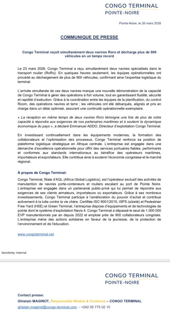 Congo Terminal reçoit simultanément deux navires Roro et décharge plus de 900 véhicules en un temps record